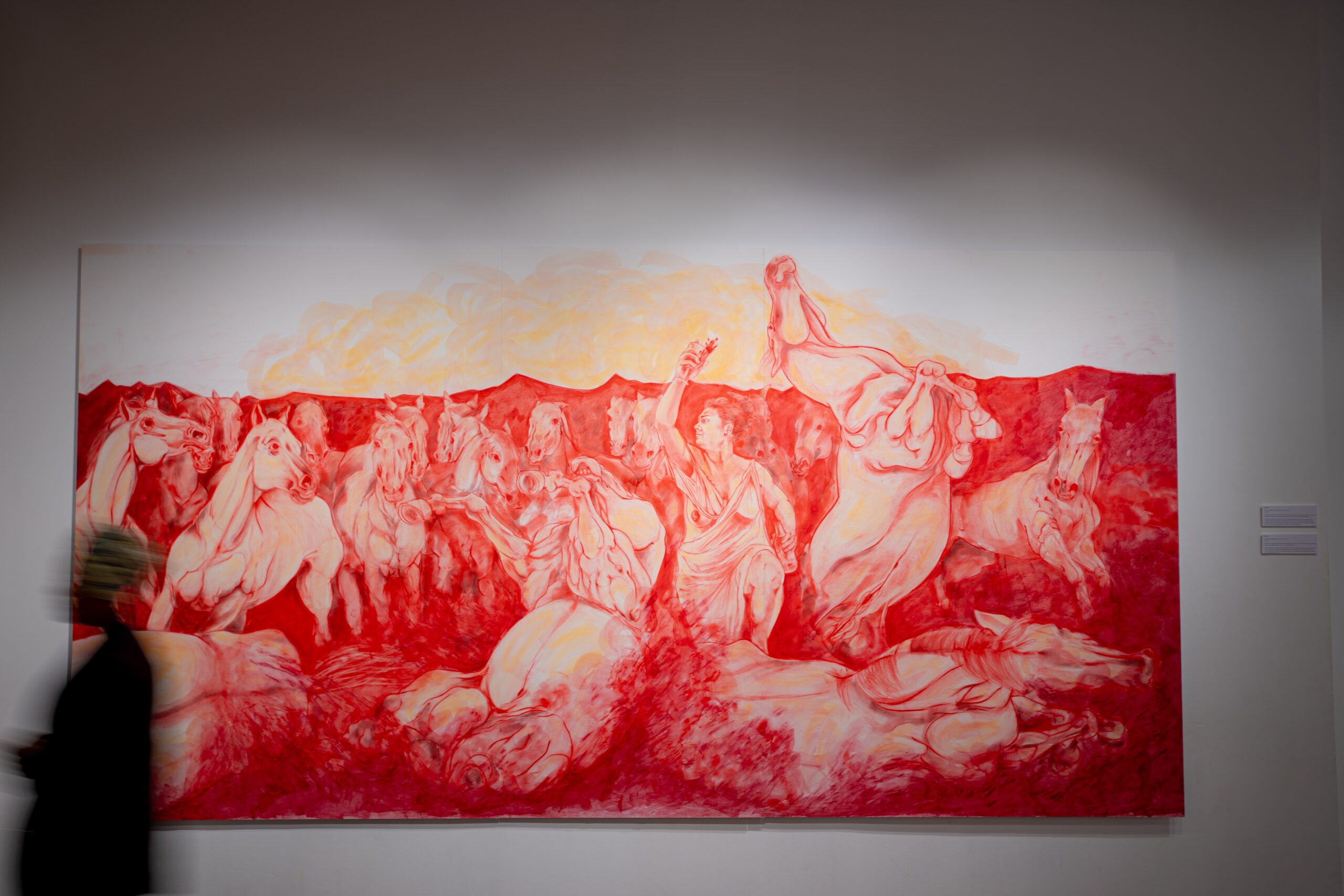 Victory reinterprets Henri Regnault’s Automedon with the Horses of Achilles through the lens of an Arab woman, replacing the male hero with a composite self-portrait embodying historical heroines from East and West.